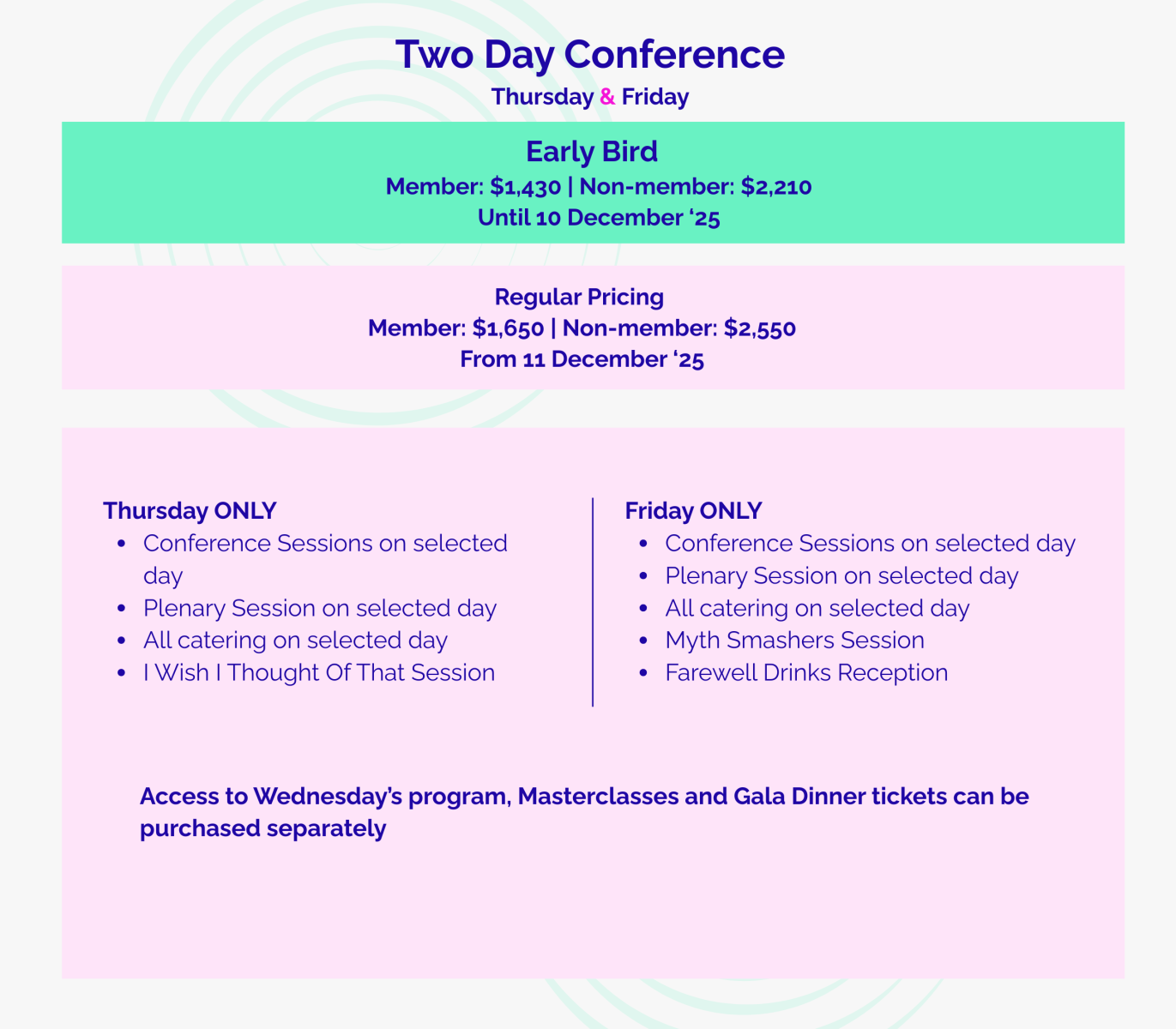 A number of pre-conference masterclasses will run on Wednesday 25 February. Limited numbers apply and will be filled on a first come first served basis. Delegates can select one masterclass only. Pre-Conference Masterclass registration inclusions: