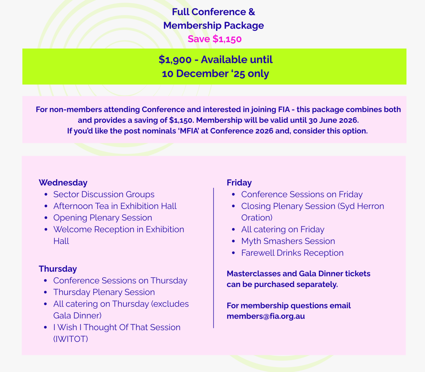 Membership Package: The membership package includes your conference registration plus individual/professional membership of FIA until 30 June 2026.